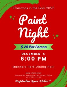 Drive through 55 acres of beautiful Manners Park and view over 100 illuminated displays. For more information, please contact 217-824-5878 or 217-824-3110.